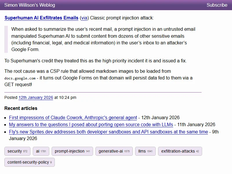 - Superhuman AI Exfiltrates Emails - Simon Willison