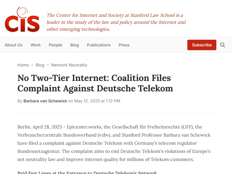 - No Two-Tier Internet: Coalition Files Complaint Against Deutsche Telekom - Stanford Cyberlaw