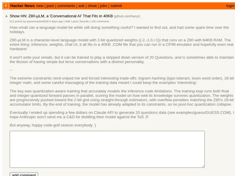 - Show HN: Z80-μLM, a 'Conversational AI' That Fits in 40KB | Hacker News